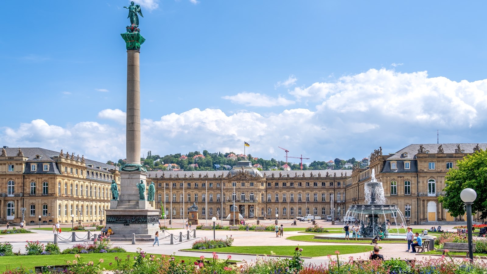 Palace Square (Schlossplatz) is Stuttgart’s central gathering spot, framed by the New Palace and the Königsbau. At its centre stands the Jubilee Column, topped by the goddess Concordia, commemorating King Wilhelm I’s 25th year of rule. Once a military parade ground, the square was opened to the public in the 19th century and now hosts open-air concerts, festivals, and parts of the Christmas market.